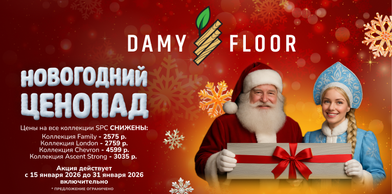 Мы услышали ваши пожелания! В связи с невероятным спросом и вашим высоким интересом, мы с объявлением объявляем о продлении самой выгодной акции на усовершенствованный кварц-виниловый пол! Специальные цены на коллекции SPC Damy Floor – Ascent Strong, Family, London и Chevron – теперь действуют до 31 января 2026 года включительно! Это ваш шанс приобрести один из самых надежных и стильных водостойких полов на рынке по максимально привлекательной цене!